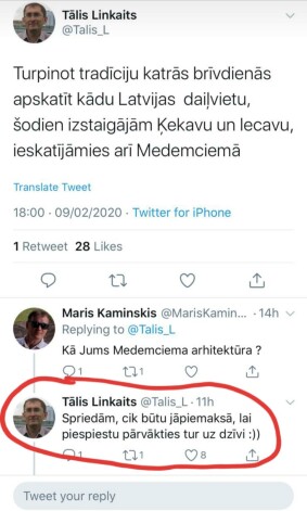 Medemciema iedzīvotājos sašutumu un neizpratni ir radījis satiksmes ministra Tāļa Linkaita (JKP) publicētais ieraksts mikroblogošanas vietnē "Twitter", kas pašlaik jau ir izdzēsts, informēja Medemciema iedzīvotāju protesta akcijas darba grupa.