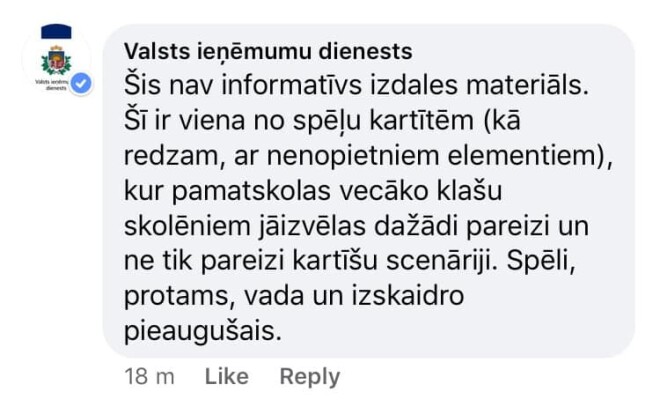 Tomēr līdz šim izmantotos skolu programmas „Dzīvei gatavs” izmantotos spēļu kartīšu tekstus VID Jauns.lv liedzās atklāt. „Kā jau skaidrojām, sociālajos tīklos publicētais attēls ir tikai viena no teju trīsdesmit spēlē iekļautajām izvēlēm saistībā ar nodokļu maksāšanu. Tās nav paredzētas patstāvīgai izmantošanai ārpus nodarbības, jo neviena no šīm izvēlēm nav analizējama ārpus spēles konteksta. Visas izvēles spēles gaitā lektora vadībā tiek pārrunātas nodarbības laikā,” teica Teice-Mamaja.