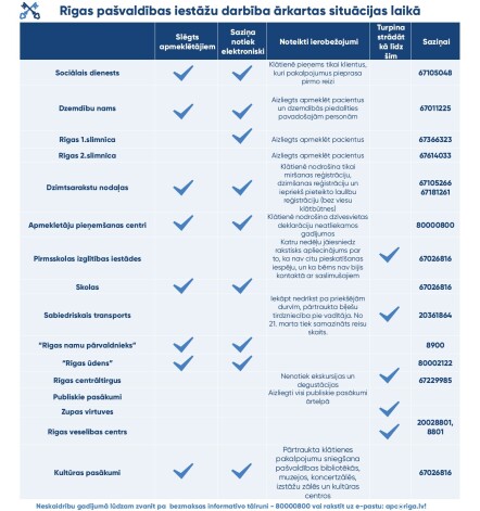 • Gandrīz visās Rīgas pašvaldības struktūrās, iestādēs un uzņēmumos pārtraukta apmeklētāju pieņemšana klātienē;