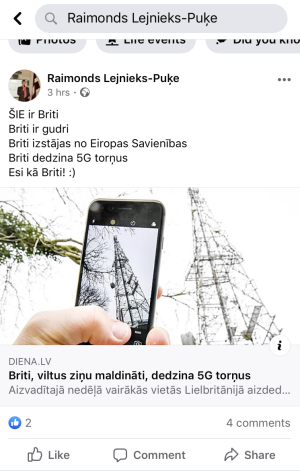 Īsi pēc tam, kad mediji ziņoja par situāciju Lielbritānijā, kur, iespaidojoties no dezinformācijas un sazvērestības teorijām, atsevišķi cilvēki metās dedzināt 5G sakaru torņus, vainojot tehnoloģiju Covid-19 izplatīšanā, savu nostāju sociālajā tīklā "Facebook" pauda arī Raimonds Lejnieks-Puķe.