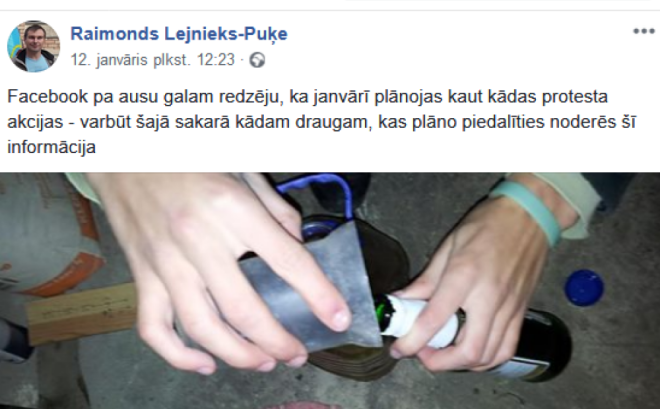 “[...] pa ausu galam redzēju, ka janvārī plānojas kaut kādas protesta akcijas – varbūt šajā sakarā kādam draugam, kas plāno piedalīties noderēs šī informācija,” klāt pierakstīja Lejnieks-Puķe, kurš tolaik strādāja apsardzes firmā SIA “Grifs AG”. Tieši šis ieraksts piesaistīja drošībnieku uzmanību.