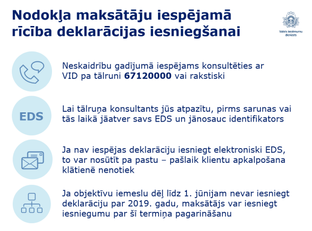 Tā kā ārkārtējās situācijas dēļ VID nepieņem klientus klātienē, aicinām iesniegt deklarāciju elektroniski, VID Elektroniskās deklarēšanas sistēmā, kas ir arī ērtāk un vienkāršāk.