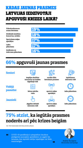 Interesanti, ka daudz izteiktāk nekā citas sabiedrības grupas, tieši seniori atzīst, ka ir apguvuši un novērtējuši iespējas skatīties koncertus un izrādes digitālajā vidē, kā arī apguvuši sociālo tīklu lietošanas prasmes. Savukārt jaunieši un vidējā paaudze daudz vairāk nekā citas grupas ir apguvuši sportot prasmes mājas apstākļos, kā arī laika plānošanu.