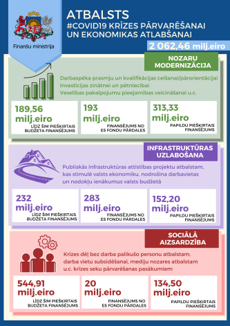 Tajā norādīts, ka kopumā valsts atbalsts pasākumiem Covid-19 krīzes pārvarēšanai un ekonomikas atlabšanai sasniedzis 2,1 miljardu eiro. No minētās summas valdība dažādiem pasākumiem jau ir rezervējusi 966,46 miljonus eiro, no kuriem līdz 31.maijam reāli piešķirti 228,67 miljoni eiro, piemēram, dīkstāves pabalstu izmaksai u.c. atbalsta programmām. Vienlaikus valdība iepriekš arī lēmusi dažādiem ministriju pasākumiem pārdalīt Eiropas Savienības fondus 496 miljonu eiro apmērā.