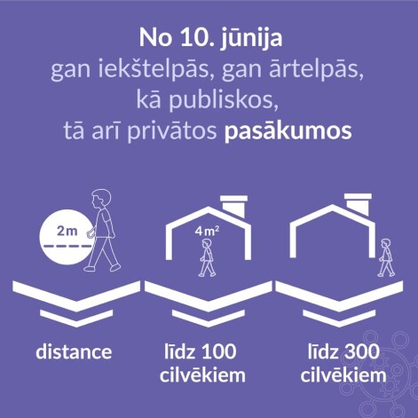 Līdz jūnija beigām pasākumos iekštelpās varēs pulcēties ne vairāk kā 100, bet ārā - ne vairāk kā 300 cilvēku.