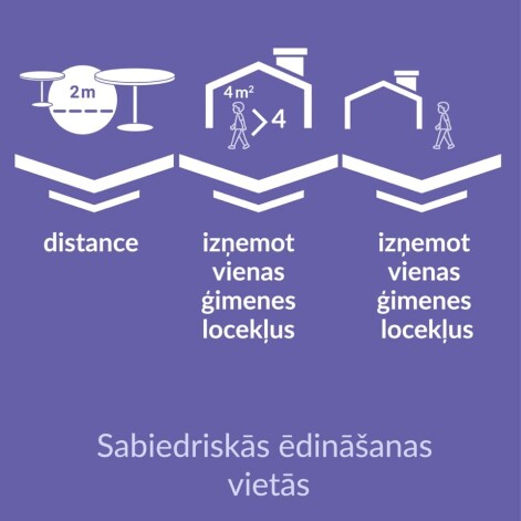 Sabiedriskās ēdināšanas pakalpojuma sniedzējam sabiedriskās ēdināšanas vietā papildu būs jānodrošina, ka tiek ievērota divu metru distance starp galdiņiem, ja starp tiem nav izveidota norobežojoša siena.