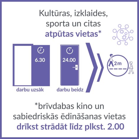 Kultūras, sporta, izklaides, sabiedriskās ēdināšanas un reliģiskās darbības veikšanas vietas darbu drīkst uzsākt ne agrāk kā plkst.6.30 un beigt ne vēlāk kā plkst.24, izņemot brīvdabas kino demonstrācijas pasākumus, kuri jābeidz ne vēlāk kā plkst.2.