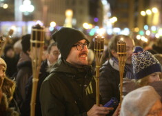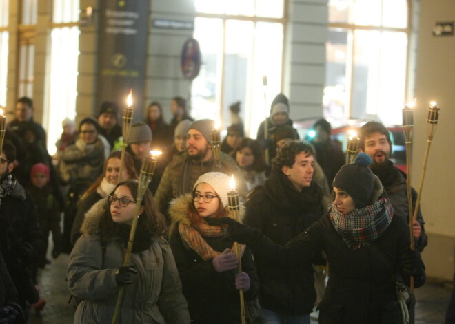 Vairāki simti cilvēku dodas lāpu gājienā no Brāļu kapiem līdz Brīvības piemineklim