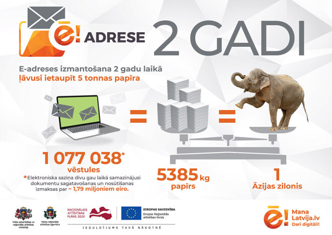 Kopš 2018. gada jūnija, kad uzsāka darboties vienotā digitālā pastkastīte jeb e-adrese, nosūtītivairāk nekā 1 077 038 elektroniski ziņojumi. Pieņemot, ka katrs elektroniski nosūtītais ziņojums ir viena standarta A4 papīra lapa, tad divu gadu laikā būtu iztērētas 2154 pakas biroja papīra (vienā biroja papīra pakā ir 500 lapas), kas ir 5385 kilogrami (vienas biroja papīra pakas svars ir vidēji 2,5 kilogrami). Salīdzinājumam –Rīgas Nacionālā zooloģiskā dārza speciālisti apliecināja, ka piecas tonnas vidēji sver Āzijas zilonis. Tiesa, pēdējais Latvijā dzīvojušais zilonis Radža esot bijis krietni diženāks savas sugas pārstāvis un svēris gandrīz sešas tonnas.