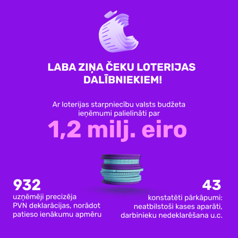 Informācija, ko VID ik mēnesi saņem no loterijā iesniegtajiem čekiem un kvītīm, palīdz atklāt būtiskus pārkāpumus nodokļu ieņēmumu jomā, piemēram, VID nereģistrēto vai no uzskaites noņemto un tehniskajām prasībām neatbilstošu kases aparātu lietošanu, ieņēmumu neuzrādīšanu deklarācijās vai, nereģistrēšanos pievienotās vērtības nodokļa maksātāju reģistrā.