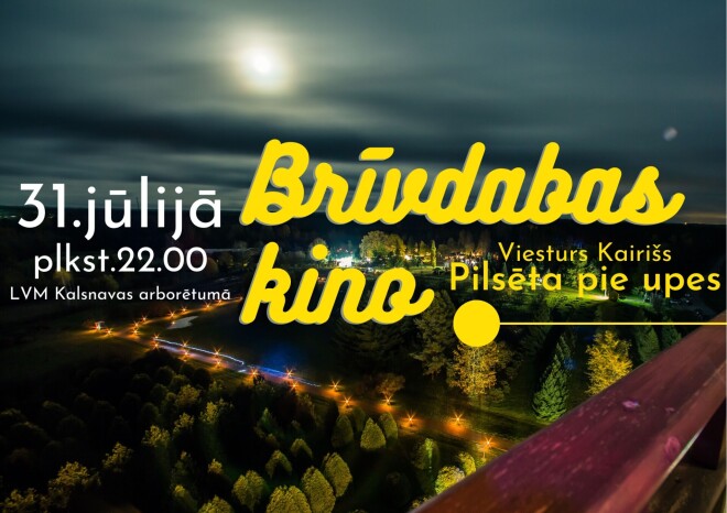 Programmā no plkst.19.00 aktivitātes ģimenēm, plkst.21.00 tikšanās ar filmas aktieriem Agnesi Cīruli un Gundaru Āboliņu, plkst.22.00 filmas “Pilsēta pie upes” seanss. Tā ir iespēja skatītājiem izbaudīt romantisku vasaras gaisotni LVM Kalsnavas arborētumā.