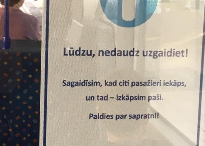 „Lūdzu, nedaudz uzgaidiet! Sagaidīsim, kad citi pasažieri iekāps, un tad – izkāpsim paši. Paldies par sapratni!” Šāds absurds plakāts pirms dažām dienām samulsināja rīdzinieci, kura jau kopš bērnības pieradusi sabiedriskajā transportā ievērot vispārpieņemto normu – vispirms pasažieri izkāpj, bet brauktgribētāji iekāpj tikai pēc tam. Vai tagad kārtība mainījusies un pasažieriem turpmāk nāksies haotiski spaidīties?