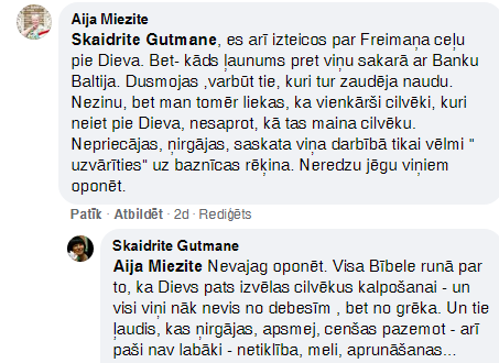 Sociālajos tīklos ticīgie komentē bijušā „Bankas Baltija” prezidenta Tāļa Freimaņa kļūšanu par luterāņu mācītāju. Daži viņam vēl veiksmi un pauž „grēku piedošanu”, bet tikpat daudzi arī izsaka neizpratni par Latvijas evaņģēliski luteriskās baznīcas (LELB) nodomu pilntiesīga mācītāja amatā ordinēt cilvēku, kurš vainojams pie daudzu „Bankas Baltija” noguldītāju finansiālā kraha pirms 25 gadiem.