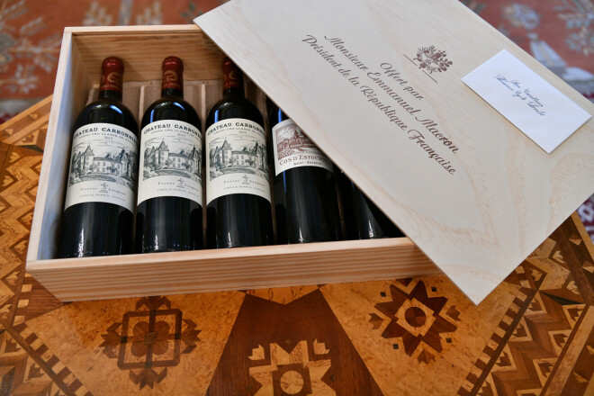 FOTO. Levitu un Makronu pāri apmainās ar dāvanām