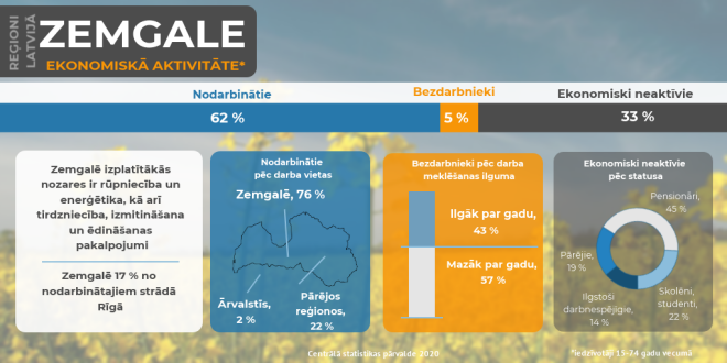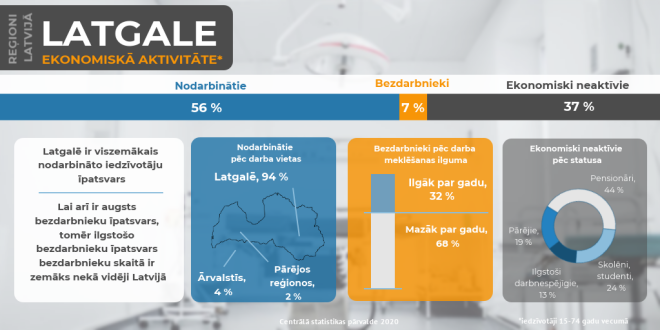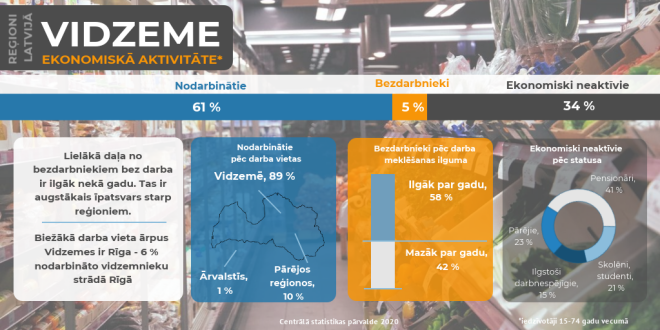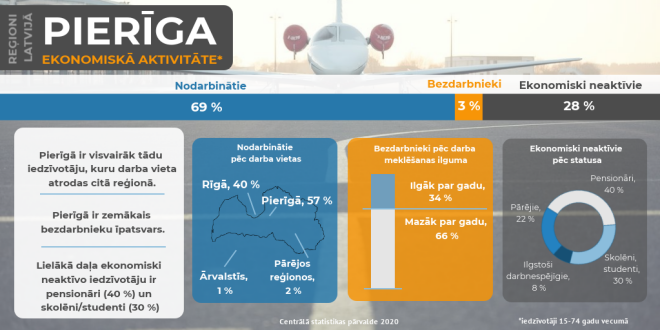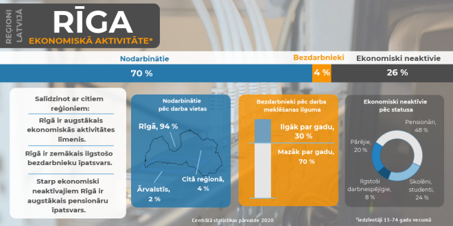 Rīga un Pierīga, pēc statistikas pārvaldes datiem, ir reģioni, kas izceļas arī ar augstākajiem nodarbinātības rādītājiem - attiecīgi 70% un 69% iedzīvotāju 15-74 gadu vecumā ir nodarbināti. Savukārt zemākais šis rādītājs ir Latgalē, kur 56% iedzīvotāju šajā vecuma grupā ir nodarbināti.