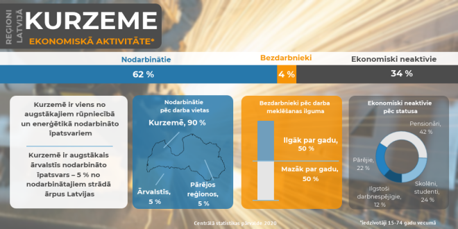 Arī Kurzemē šis rādītājs ir augsts - tur ilgāk par gadu darbu nevar atrast puse no bezdarbniekiem. Tajā pašā laikā Kurzemē 5% iedzīvotāju darbavieta nav Latvijā, kas ir augstākais rādītājs starp reģioniem.