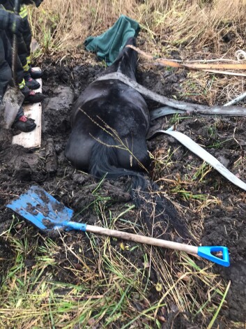 "Ugunsdzēsēji glābēji nedaudz atraka dubļus, ap zirga vēderu aplika šļūtenes un tad ar traktoru dzīvnieks tika izvilkts krastā."