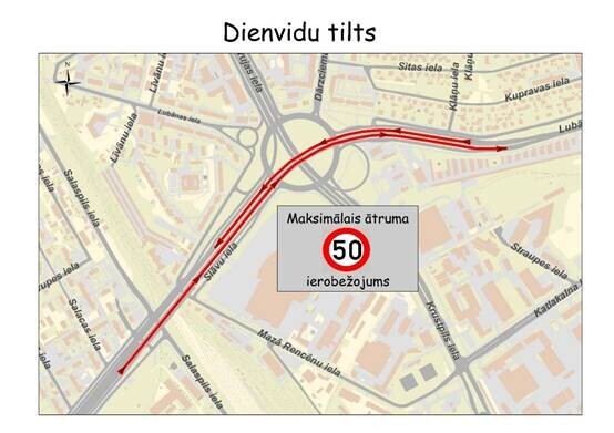 Braukšanas ātrums tiks samazināts posmā no uzbrauktuves no Maskavas ielas līdz Lubānas ielai un pretējā tilta brauktuves pusē, no Lubānas ielas līdz uzbrauktuvei no Piedrujas ielas.