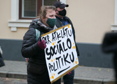 Visiem protesta dalībniekiem ir sejas aizsargmaskas. Cilvēkiem rokās ir plakāti "Sociālie darbinieki, uzticība, palīdzība citiem". Sociālie darbinieki valdībai pieprasa nodrošināt ...