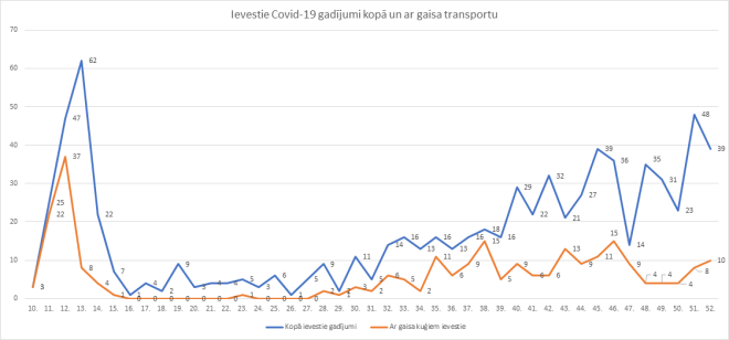 CAA Ārkārtas situāciju un komunikācijas vadītājs Aivis Vincevs Jauns.lv, atsaucoties uz aģentūras rīcībā esošajiem SPKC datiem, informēja, ka 2020. gadā, laikā no 10. līdz 52. nedēļai (no 2. marta līdz 27. decembrim, ieskaitot) Latvijā ar aviāciju tika ievesti 245 gadījumi, kas vidēji ir 5,7 gadījumi nedēļā jeb viens Covid-19 gadījums uz katriem 2030 ielidojošajiem pasažieriem.