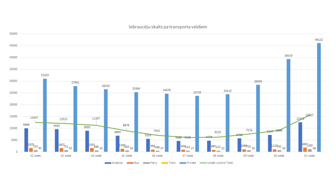 Piemēram, šī gada 51. nedēļā (no 14. līdz 20. decembrim) Latvijā ar kontrolētajiem pārvadātājiem ieradās 15 607 pasažieri, kamēr caur sauszemi ar privāto transportu – 46 122 pasažieri.