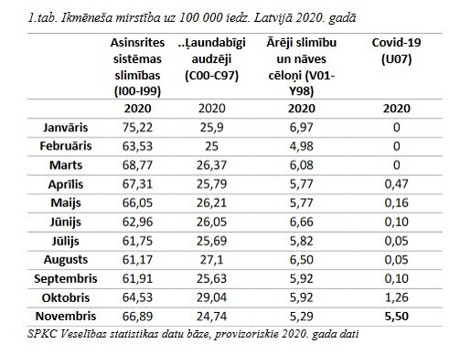 Dati liecina, ka pērn mirstības rādītāji pieauga tiem cilvēkiem, kas ilgstoši slimo ar endokrīnām un onkoloģiskām kaitēm, bet no hroniskām sirds un asinsrites slimībām mirstības rādītāji pieauga tikai pašās gada beigās - oktobrī un novembrī.