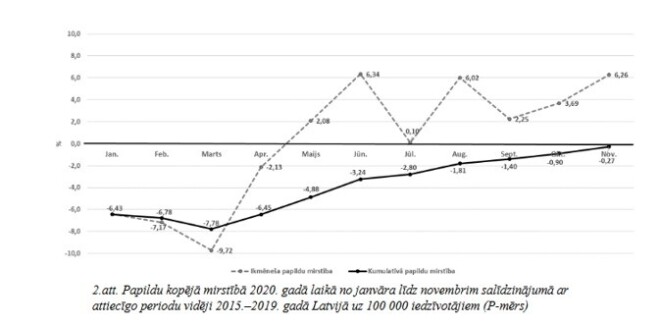"Sākot ar maiju, ikmēneša papildu mirstības (excess mortality) rādītājs ir pozitīvs, salīdzinot ar iepriekšējiem pieciem gadiem. Mūsu eksperti sagaida, ka šiem 11 mēnešu datiem, pieliekot klāt decembra skaitļus, kopējā mirstība valstī 2020. gadā būs augstāka," Ķīvīte-Urtāne prognozēja.