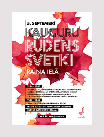 Šis ir Raiņa jubilejas gads, tāpēc arī Kauguru rudens svētku programma sasaucas ar izcilā latviešu dzejnieka dramaturģijas pērlēm. Jūrmalas kolektīvu muzikālie, deju un teātra priekšnesumi apvienoti ar nosaukuma “Spēlēju, dancoju”, aktivitātes un radošās darbnīcas bērniem caurvij Zelta zirga tematika, bet izglītojošās aktivitātes pieaugušajiem par Kauguru vēsturi un jūru, kā arī erudīcijas un sportiskās formas pārbaudes iekļautas pasākumu kopumā “Pūt, vējiņi!”. Lūk, Kauguru rudens svētku aktivitātes!