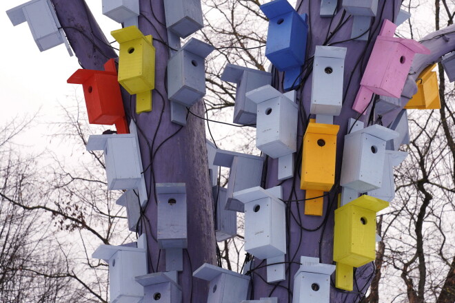 Pērnā gada oktobra izskaņā Esplanādē uz nokaltuša koka tika izlikti desmitiem putnu būrīšu.