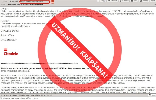 Patlaban ļoti aktīvi tiek izplatīti krāpnieciski e-pasti bankas "Citadele" vārdā par it kā apstiprinātu apmaksu, kam pievienotais pielikums ir vīruss, kas zog paroles, mikroblogošanas vietnē "Twitter" vēsta IT drošības incidentu novēršanas institūcija Latvijā "Cert.lv".