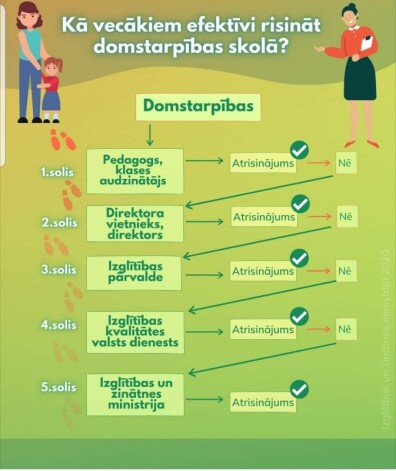 Ministrijā ieteica iepazīties ar Izglītības kvalitātes valsts dienesta sagatavoto shēmu, kā vecākiem risināt domstarpības skolā.