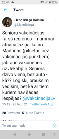 Iveta turpina savu stāstījumu: “Pēc dienas jau jutos priecīga, ka maniem vecākiem vakcīna tomēr “spīd”. Tiesa līdz vakcinācijas punktiem vakcīna nav vēl atbraukusi, bet īsziņas atnāca, ka jāzvana un jāpiesakās. Bet tie, kuri plāno senioru vakcināciju, var teikt, ir loģikas “ģēniji”! Tētim atnāca uzaicinājums un Jēkabpili, bet mammai uz Gulbeni. Paskatieties Latvijas kartē – Jēkabpils un Gulbene atrodas katra uz savu pusi no Madonas, pirmā uz dienvidiem, bet otrā uz ziemeļiem. Manējie, paldies Dievam, izbraukās - ir savs auto un arī benzīnam nauda būs. Bet ko lai dara tie seniori, kuriem šādu iespēju nav? Ar autobusu? Kājām? Ko lai dara tie, kam ar naudiņu švakāk un skaita katru eiro? Un Madonā jau ir slimnīca - ne jau lauku ambulance. Man šoreiz par šo absurdu vienkārši trūkst vārdu. Sūnu ciems… Bet vēlreiz, protams, prieks, ka vakcīna būs”.