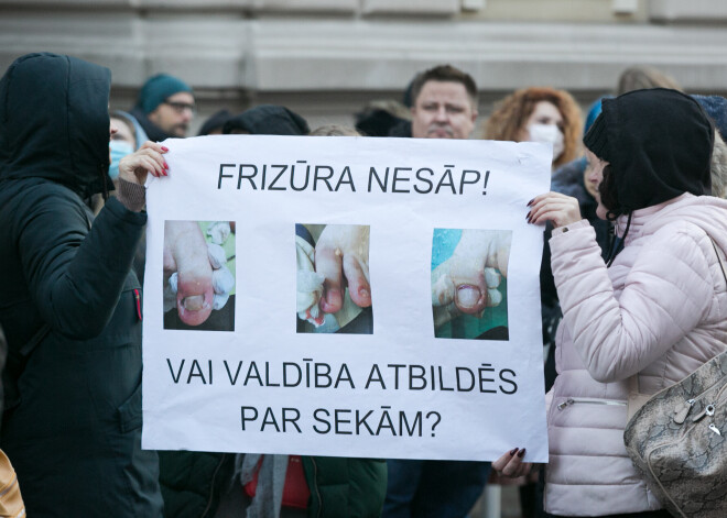 Manikīra un pedikīra meistari pirmdienas rītā pulcējās pie Saeimas ēkas Rīgā, lai piketā pieprasītu atļauju atsākt darbu, kas aizliegts Covid-19 ...