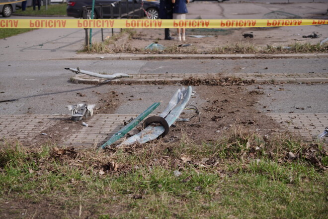 Tad šāvienu, pakaļdzīšanās vai kāda cita iemesla dēļ upura automašīna nobraukusi no braucamās daļās, braukusi pa zālienu, šķērsojusi trotuāru, vairākas nobrauktuves un sagāzusi autostāvvietas žogu. Visapkārt mētājas sīkas automašīnas atlūzas.