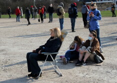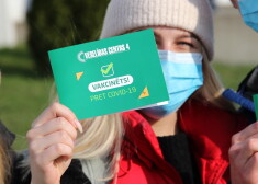 Cilvēki stāv "dzīvajā rindā", lai saņemtu poti pret Covid-19