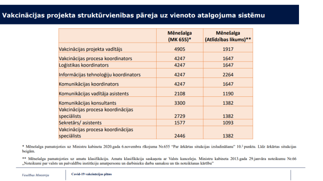 Piemēram, Vakcinācijas projekta biroja vadītāja 4905 eiro vietā saņems 1917 eiro, bet citi darbinieki - vakcinācijas procesa, loģistikas, informāciju tehnoloģiju un komunikācijas koordinatori - 4247 eiro vietā saņems 1647 eiro.