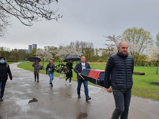 Internetā, divas dienas pirms 9. maija, ko Latvijā daļa sabiedrības atzīmē kā padomju tautas un PSRS sabiedroto uzvaru pār nacistisko Vāciju, vietējie aktīvisti līdz Uzvaras parkam aiznesa melnu zārku, kuram pārklāts Latvijas karogs.