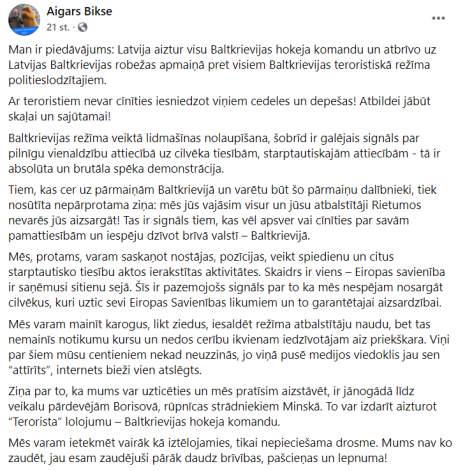 "Man ir piedāvājums: Latvija aiztur visu Baltkrievijas hokeja komandu un atbrīvo uz Latvijas Baltkrievijas robežas apmaiņā pret visiem Baltkrievijas teroristiskā režīma politieslodzītajiem," teikts Bikšes ierakstā, kas publicēts 24. maijā. "Ar teroristiem nevar cīnīties iesniedzot viņiem cedeles un depešas! Atbildei jābūt skaļai un sajūtamai!"