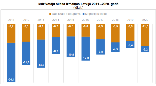 Pagājušajā gadā Latvijā piedzima 17,6 tūkst. bērnu – par 1 234 jeb 6,6 % mazāk nekā 2019. gadā, kas ir zemākais rādītājs pēdējo simt gadu laikā, bet nomira 28,9 tūkst. cilvēku – par 1 135 jeb 4,1 % vairāk. Salīdzinot ar pēdējiem gadiem, mirstība strauji pieauga 2020. gada novembrī un decembrī. Pērn nomira par 11,3 tūkst. vairāk nekā piedzima (2019. gadā – par 8,9 tūkst.), un tas ir lielākais negatīva dabiskā pieauguma rādītājs kopš 2005. gada. Savukārt starptautiskās ilgtermiņa migrācijas rezultātā iedzīvotāju skaits samazinājās tikai par 3,2 tūkst., kas ir zemākais rādītājs kopš 1989. gada.