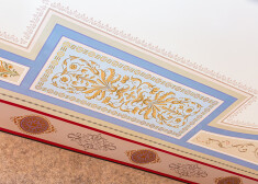 Kopā ar zāles apdari tika rekonstruēta arī krāšņā lustra un pārējie sienu apgaismes ķermeņi. Tomēr vissarežģītākais uzdevums bija atjaunot skaistos griestu gleznojumus, jo liecībās par telpas izskatu bija saglabājušas vien dažas melnbaltas fotogrāfijas, ar kurām tad nācās strādāt restauratoriem.