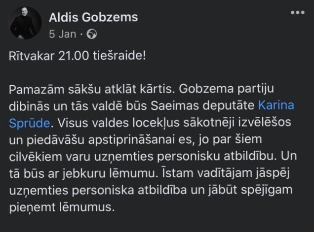 Jāatgādina, ka Gobzems savulaik solīja uzņemties atbildību personisku atbildību par katru partijas valdē apstiprināto personu.