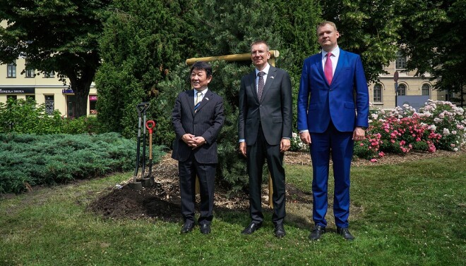 Japānas ārlietu ministrs kopā ar Rīgas domes vadību pie operas iestāda koku