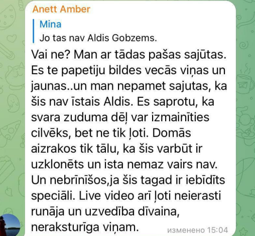Ik pa laikam publiski tiek izcelts amizantākais saturs no dažādām “antivakseru” un un citu sazvērestību teoriju piekritēju “WhatsApp”, “Telegram” saziņas grupām. Pēdējo dienu hits pavisam noteikti ir apgalvojums, ka Aldis Gobzems, kurš nesen novadīja masveida protesta akciju Rīgas centrā, nemaz nav bijis īstais Aldis Gobzems...