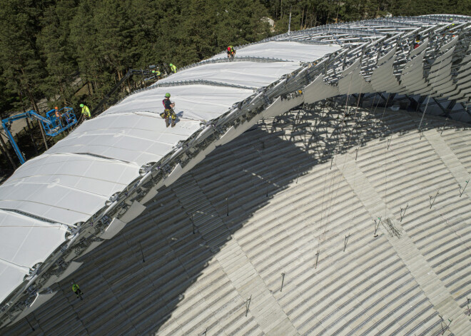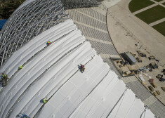 Vietējie alpīnisti darbojas ap Mežaparka Lielās estrādes kupolu
