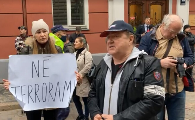 Aktīvisti skandē dziesmu par pandēmijas noliegšanu.