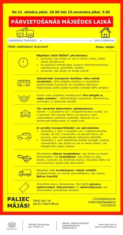 No 21. oktobra līdz 14. novembrim Latvijā uz četrām nedēļām izsludināta mājsēde jeb ieviesti stingri iedzīvotāju pārvietošanās ierobežojumi, lai būtiski bremzētu Covid-19 infekcijas izplatību, mazinātu slogu veselības aprūpes sistēmai un glābtu pēc iespējas vairāk cilvēku dzīvības. No plkst. 20.00 vakarā līdz plkst. 5.00 rītā visiem iedzīvotājiem būs jāuzturas savās dzīvesvietās.