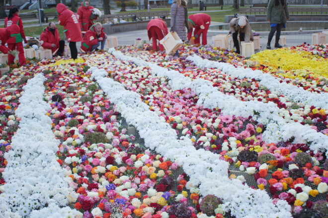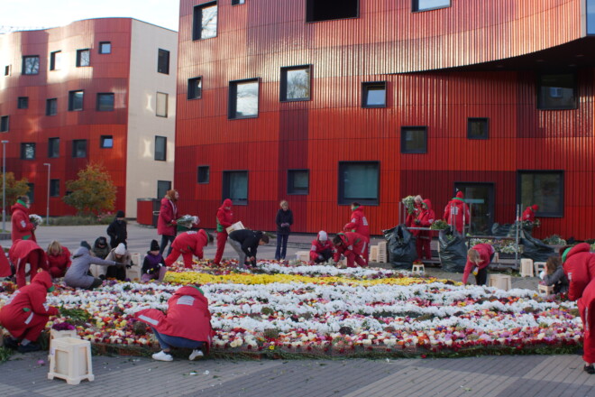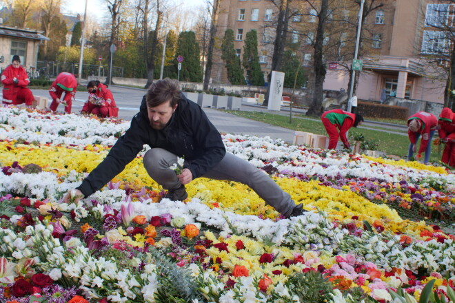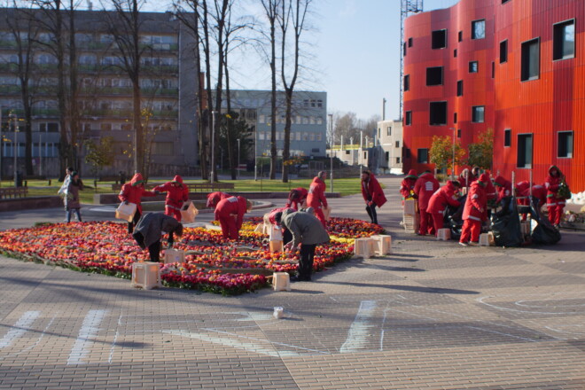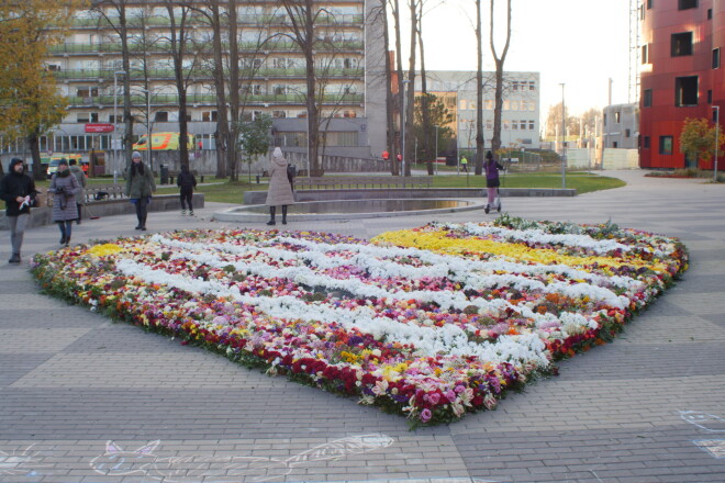 FOTO: "DEPO" medicīnas darbiniekus iepriecina ar 30 000 ziedu sirdi