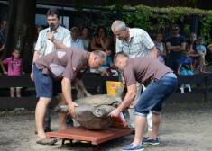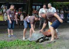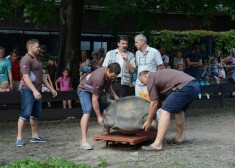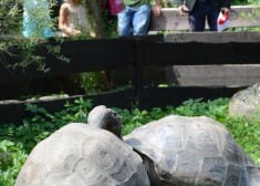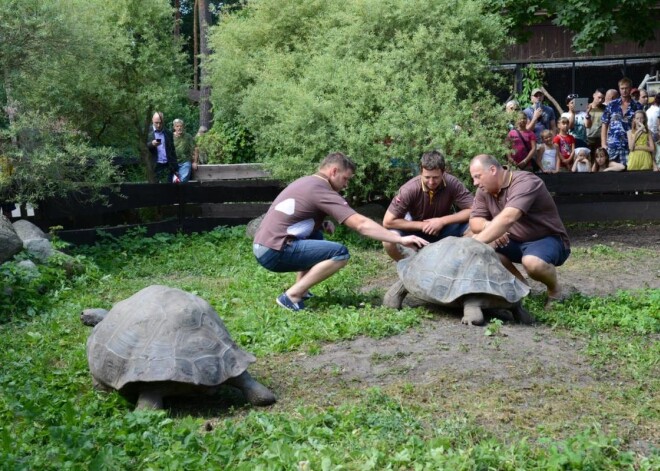 Rīgas zooloģiskajā dārzā uz piecpadsmitgades svinībām pulcējas bruņrupuču svēršanas speciālisti. FOTO
