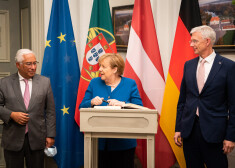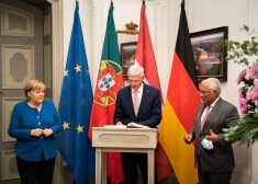 Kariņš pēc tikšanās sniedza kopīgu preses paziņojumu ar Merkeli un Portugāles premjerministru Antonio Kosta.