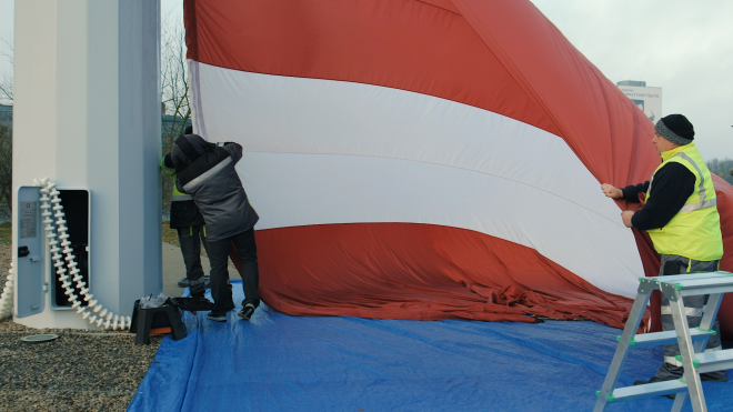 VIDEO: unikāli kadri, kā notiek Latvijā lielākā valsts karoga pacelšana mastā